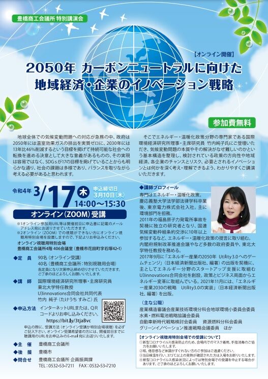 商工会議所では、エネルギー・温暖化政策の分野の専門家である、国際環境経済研究所理事・主席研究員 竹内純子氏のオンライン講演会を開催します。